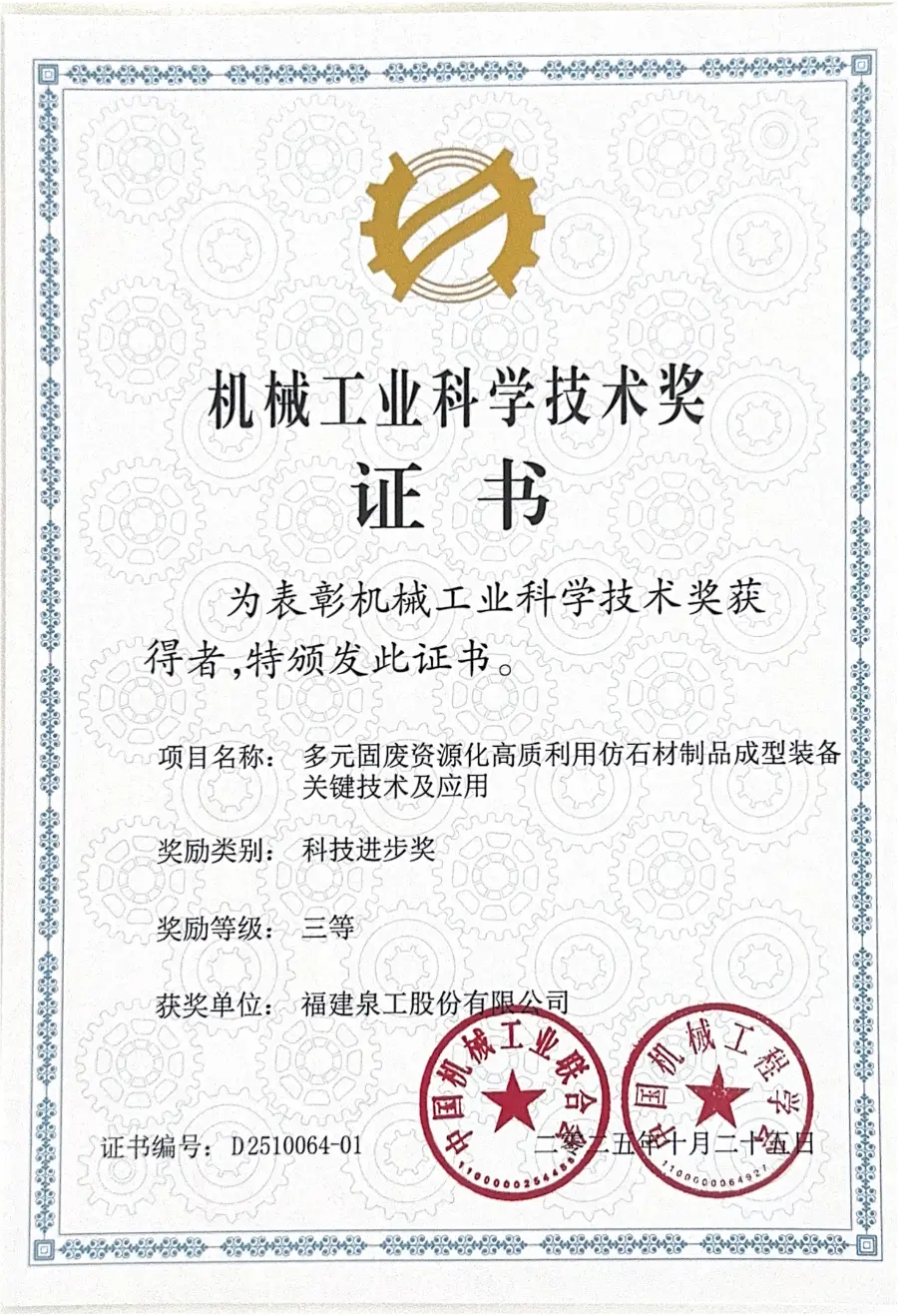 Duela gutxi, 2025eko Txinako Makineriaren Industria Zientzia eta Teknologia Sariaren irabazleen zerrenda ofizialki jakinarazi da. Fujian Quangong Machinery Co., Ltd.k zuzendutako "Key Technologies and Applications of Forming Equipment for High-Value Utilization of Diversified Solid Waste Resources into Simulated Stone Products" proiektuak aurrerapen teknologikoaren hirugarren saria irabazi zuen. Sari honek erabat erakusten du aintzatespen handiaQuangong Machinery Co., Ltd.'ren berrikuntza teknologikorako gaitasunak eta ingeniaritza-aplikazioen lorpenak hondakin solidoen baliabideen balio handiko aprobetxamenduaren eta harrizko produktu simulatuen konformazio-ekipo adimentsuak.